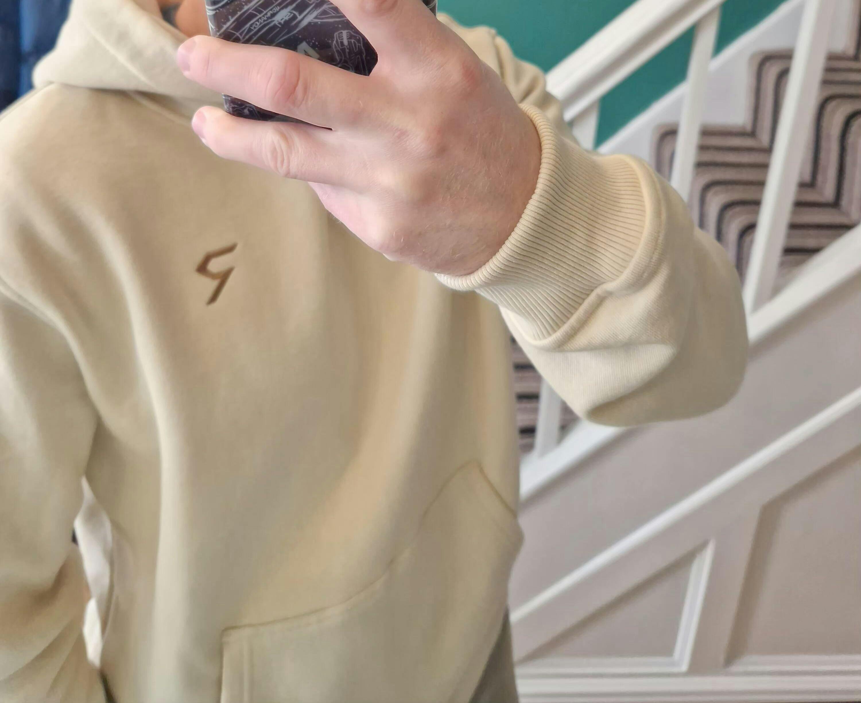 A slightly oversized beige hoodie, crafted from heavyweight 350 GSM Portuguese cotton. Our CORE hoodie is super-soft and built for ultimate comfort. It features a ribbed hem and cuffs for the perfect fit, finished with an embroidered logo to the front and printed minimal brand name to the rear.
